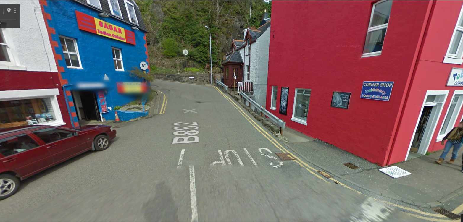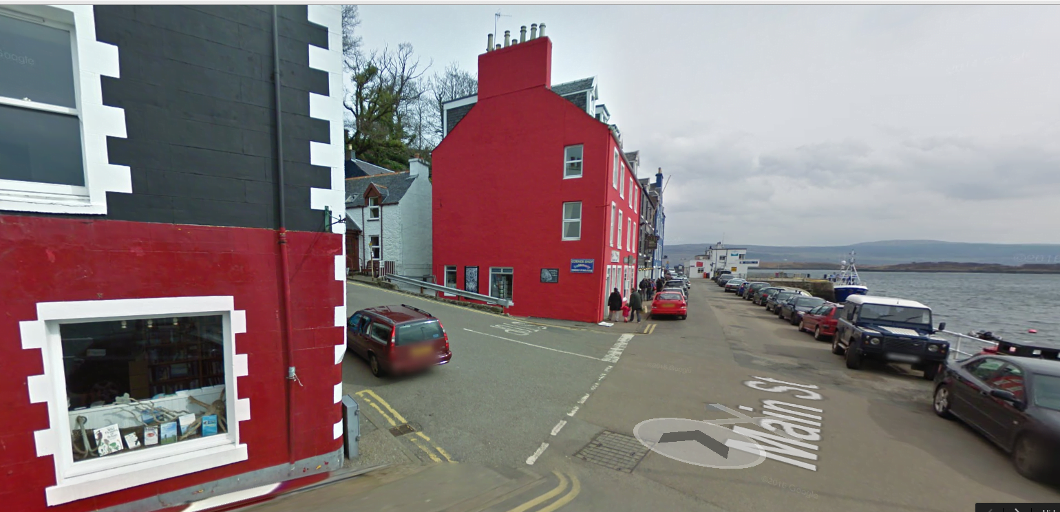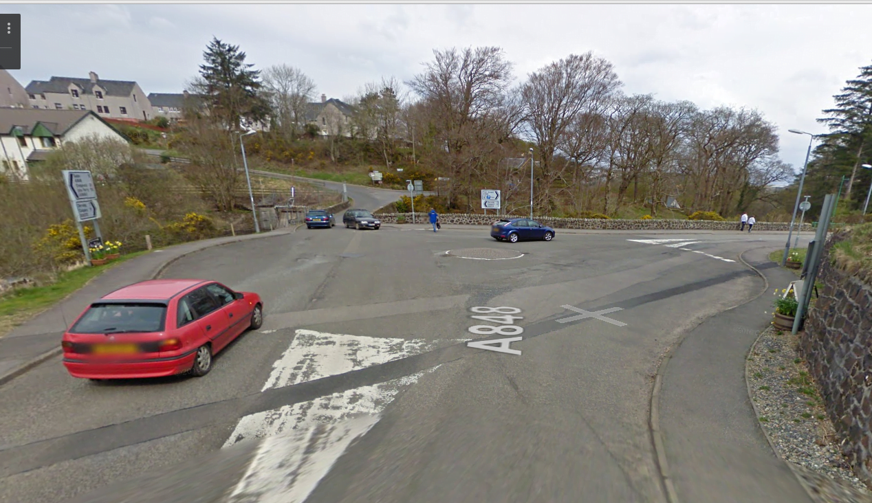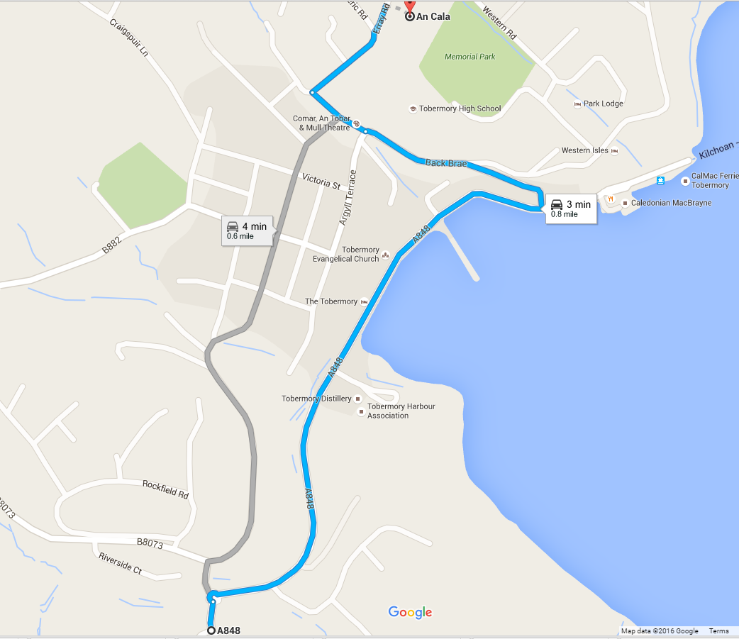 From Craignure, follow the signs to Tobermory (A849 which becomes A848 after Salen). Shortly after passing the “Welcome to Tobermory” sign, you will get to a roundabout. Follow the route in blue on the map below (copyright Google).