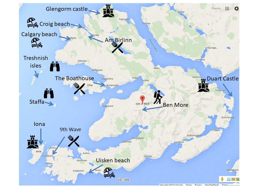 Iona is a must, in my opinion. You need to drive from Tobermory to Fionnphort (2 hours), leave the car there and get the ferry and "do" Iona on foot. No booking required. There is a nice restaurant on Iona, on the left hand side as you arrive from the ferry terminal. Wonderful landscapes, moving Abbey and immaculate beaches make Iona an ideal place for visitors of all ages.